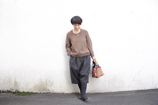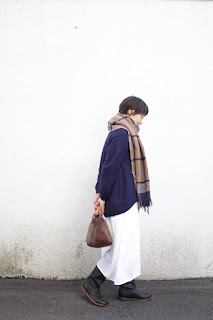 キャメルの上にカシミアウールのロングカーデを羽織り、