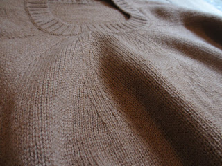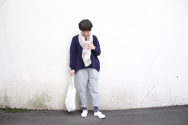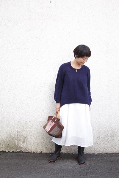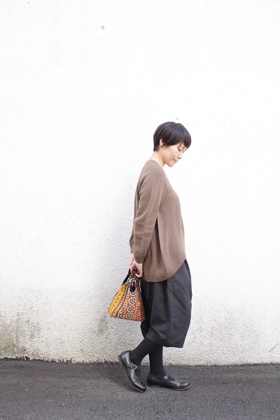 キャメルの上にカシミアウールのロングカーデを羽織り、