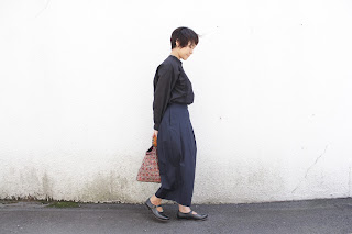 横から見ると、コクーン型のワイドパンツのよう。