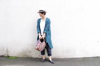 ネイビーの麻のパンツに緑青。