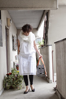 上から、ao の藍染めのカシュクールチュニックを羽織り、