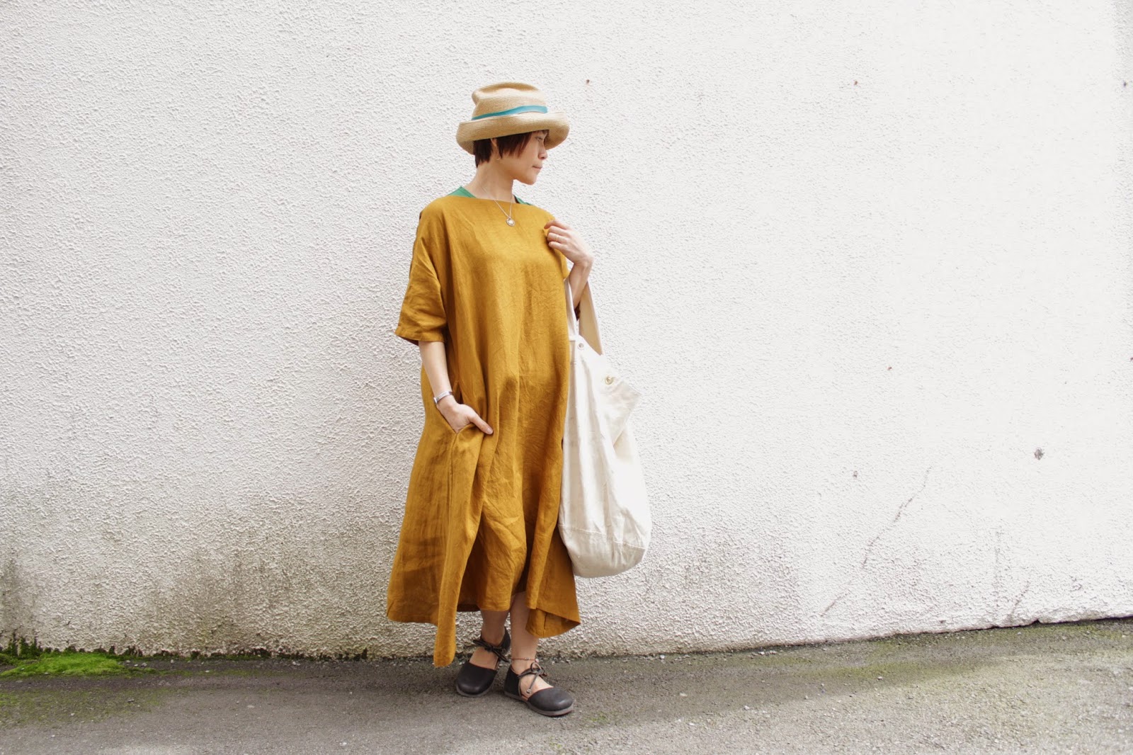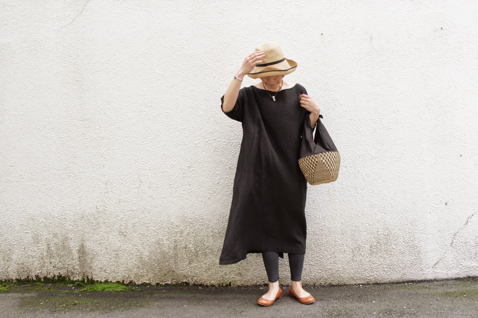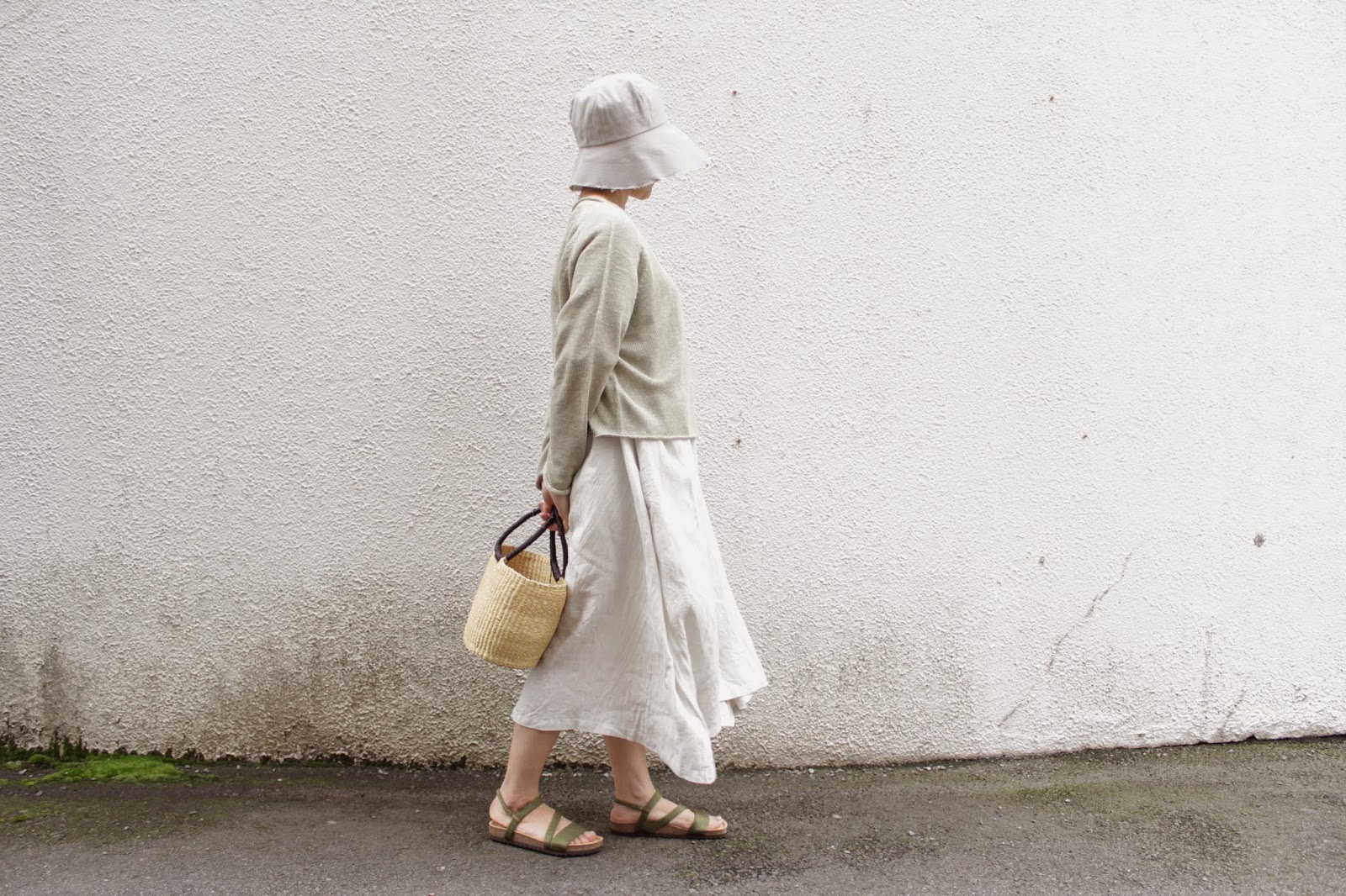 麻に麻を着て、かごバッグ。