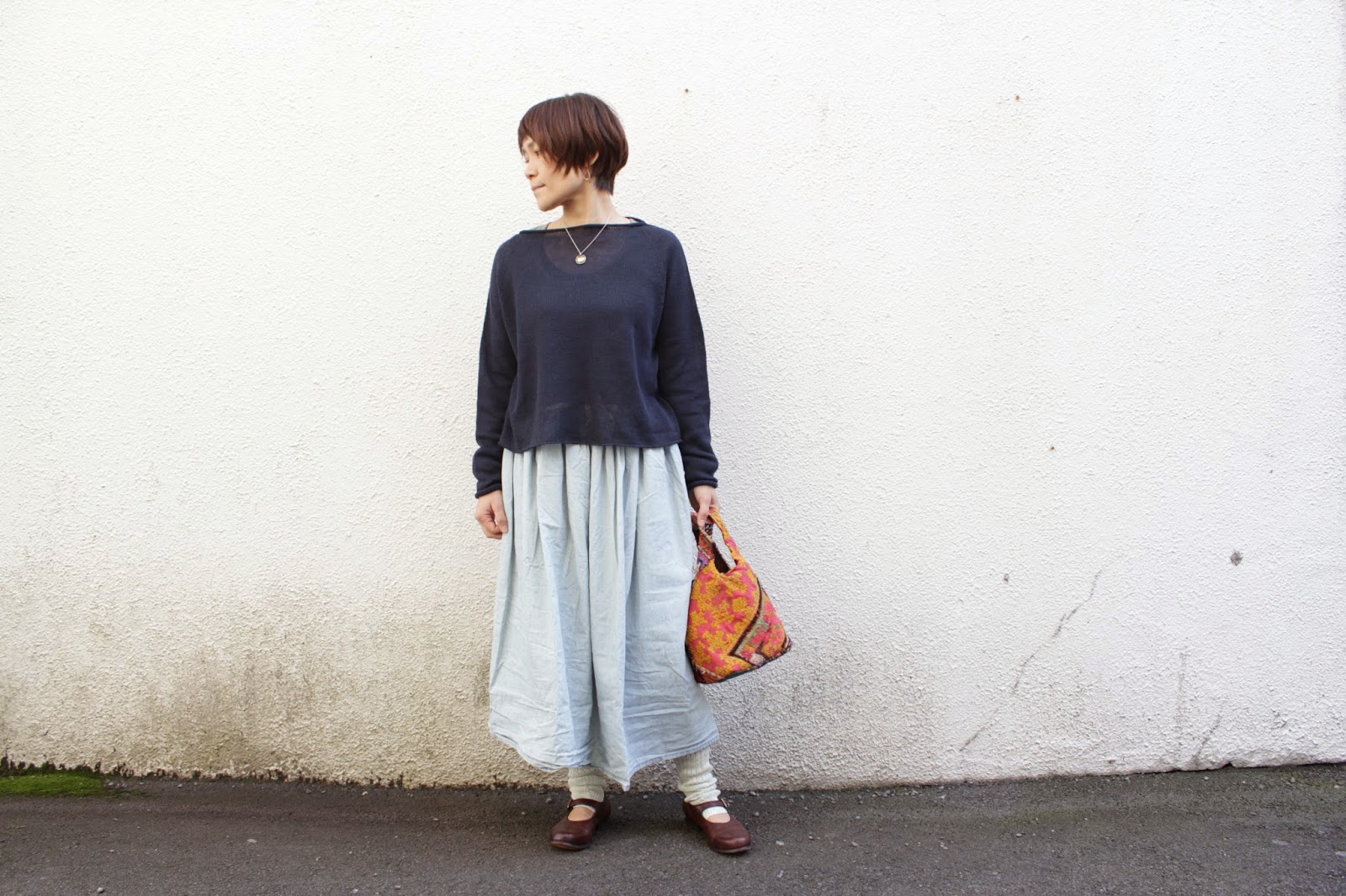 丈の少し短い、麻のニットで合わせてみよう。