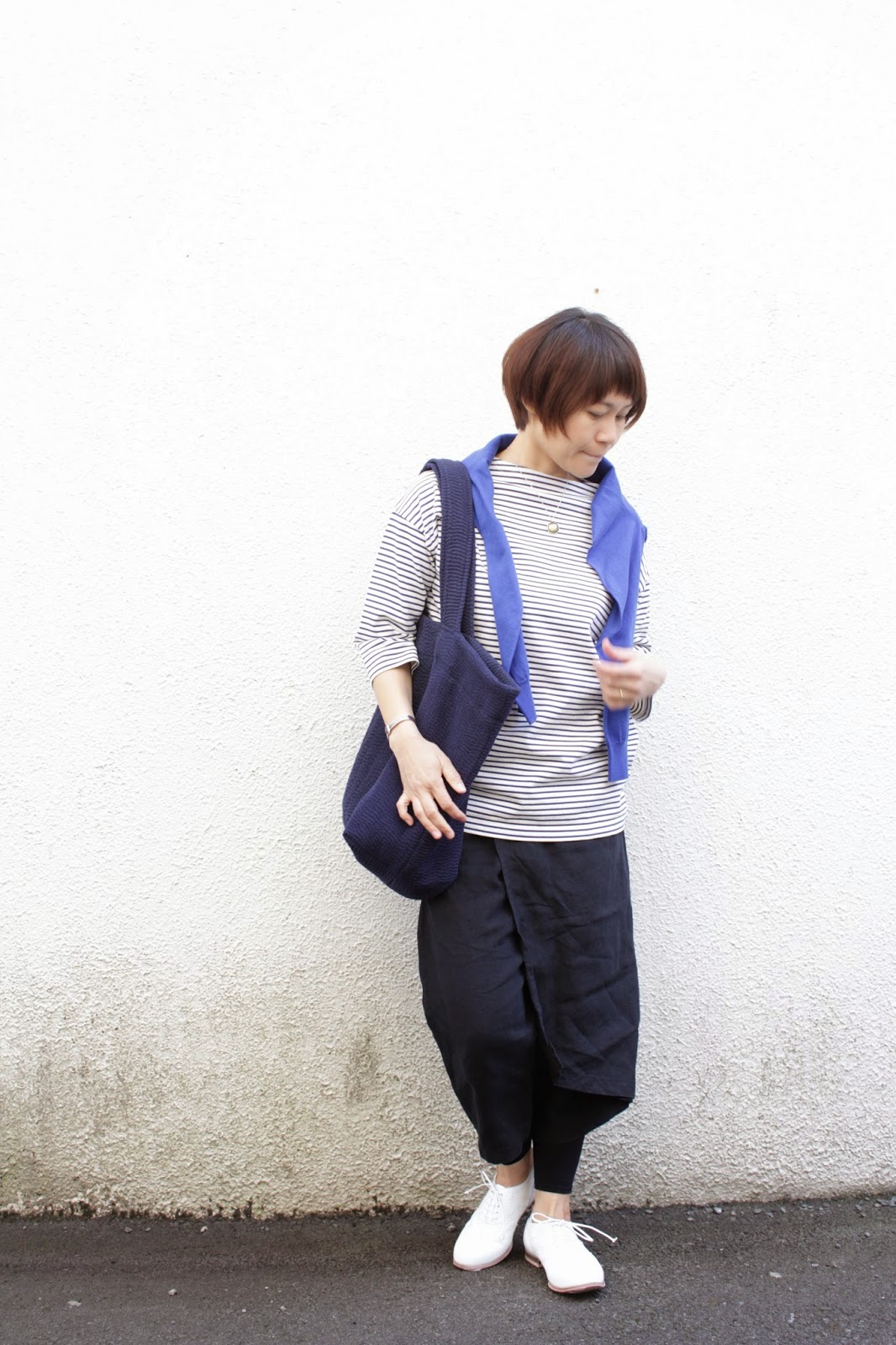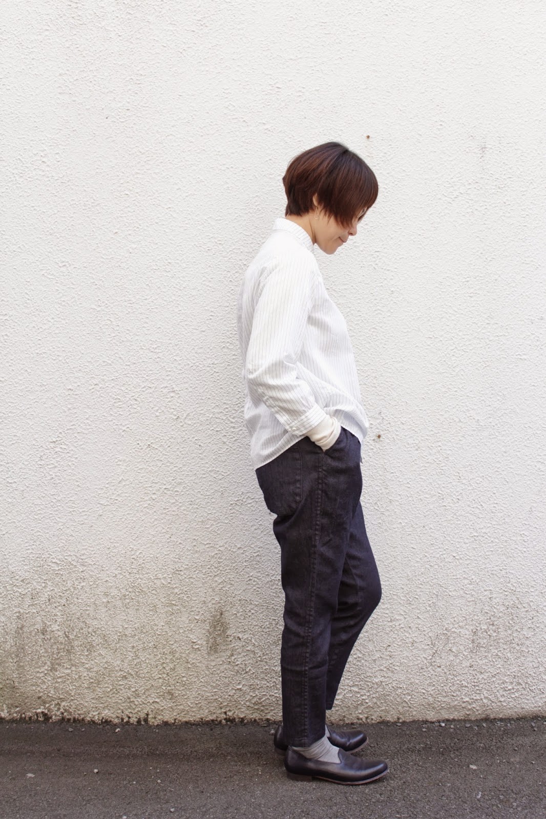 白いメダリオンシューズに細いピンストライプのシャツ。