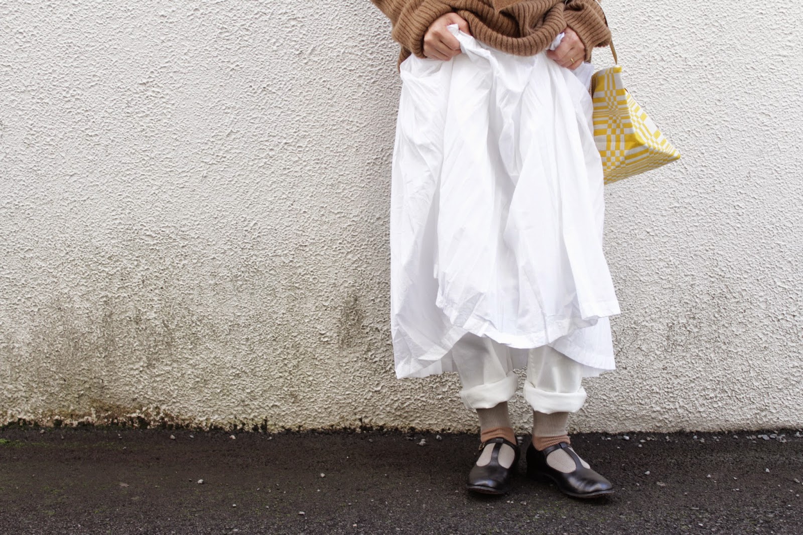 maison de soil の白いワンピースにキャメルの