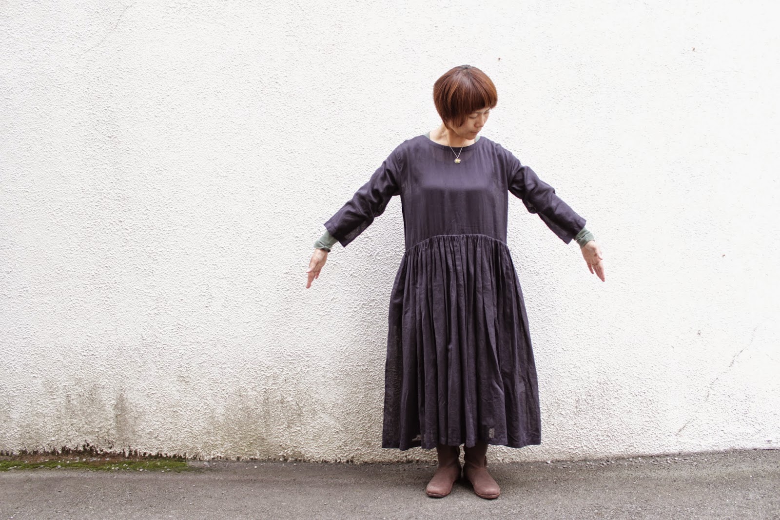 筒袖を軽くまくって、インナーをちょっとのぞかせて。。