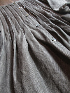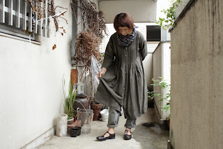 ボタンを前に、同系色でまとめて靴とストールで黒を効かせます。