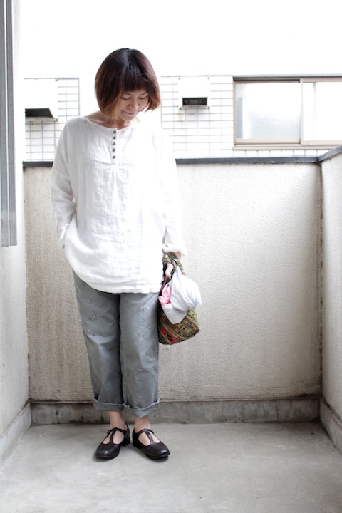 ボートネックのブラウス丈。