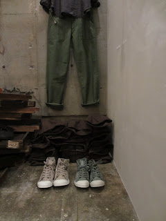 ボトムすは、ラフにアーミーパンツで。
