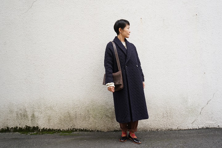 甘撚りのロービング糸を用いたオリジナル柄のWOOLコートは、