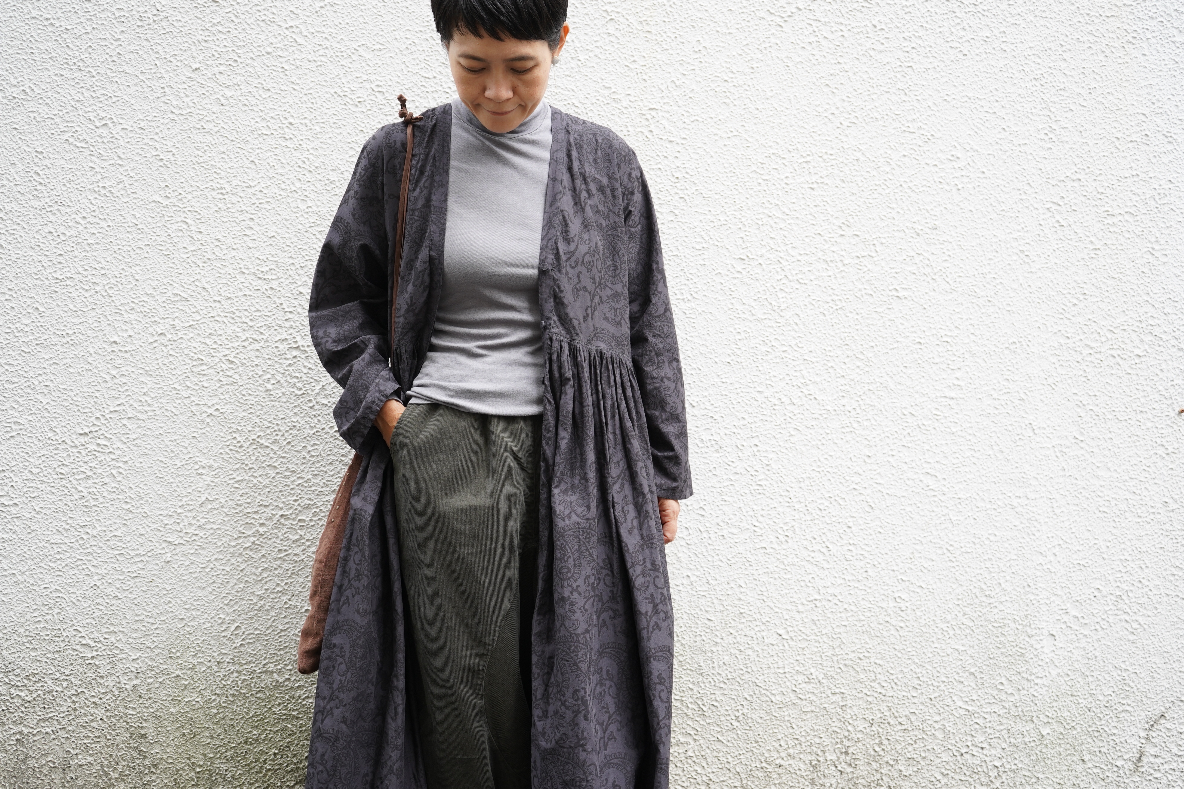 全体のAラインシルエット、布地の分量感、着丈、