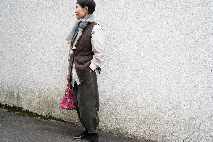 スタイリングです。重ねたベストはkhadi&Coの