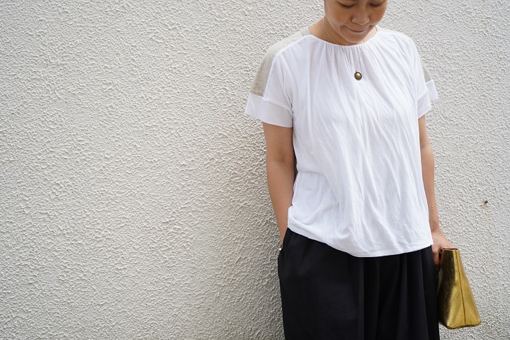 半袖を折り曲げたような印象になる袖の切り替えデザイン。