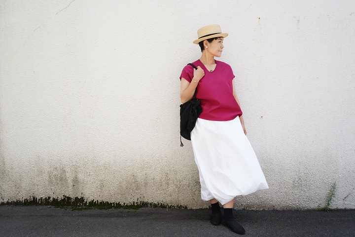 パンツスタイルでシンプルに1枚で着ても素敵です。