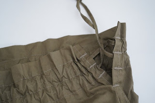 ウェストの両脇にはこのように、巾着と同じ共布のひもが。