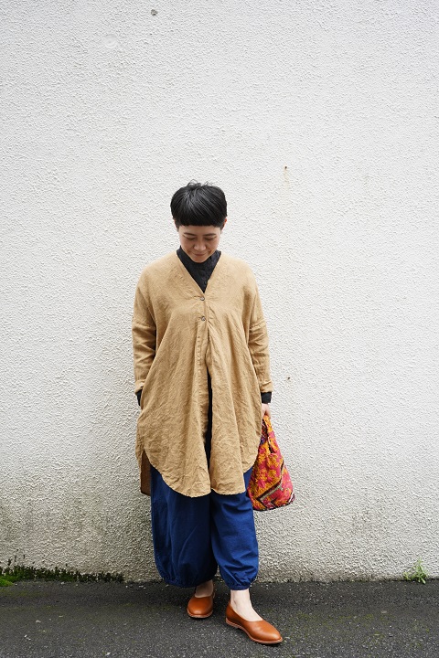 インナーにはmaison de soil のリネンの長袖刺繍シャツを着ています。