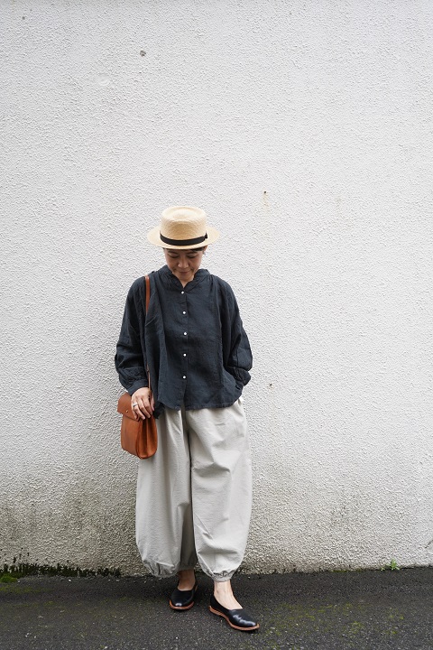 ブラックは再入荷したふんわりパンツのストーングレーに。