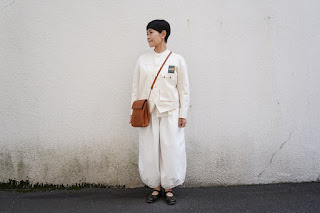 ふんわりパンツを合わせると、ワークウェア感が薄れます。