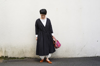 TOKIHOのシルクリネンのワンピースコートを羽織る。