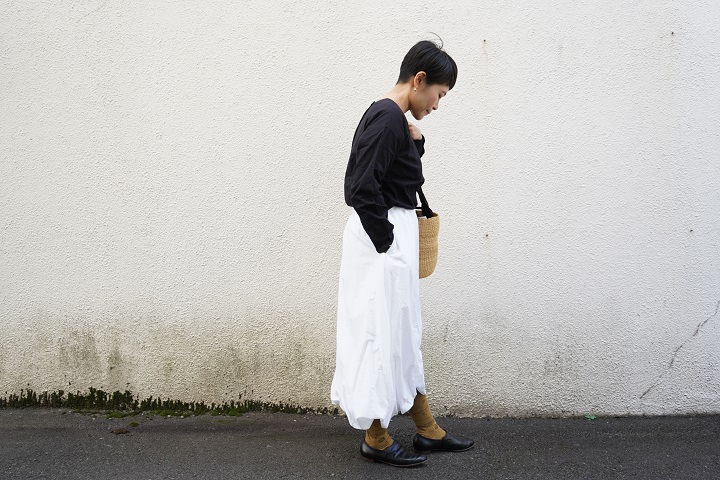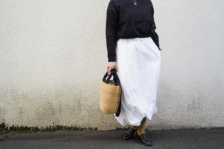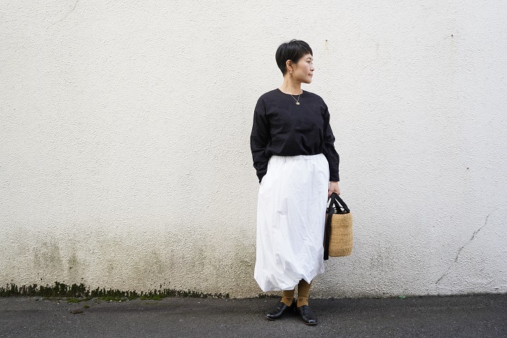 籠バッグを持って春らしく、軽やかなモノトーン。