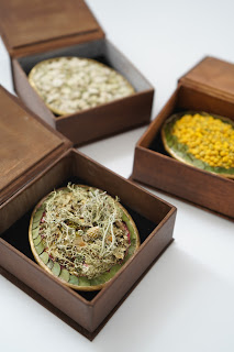 薄いブルーの箱に収まった、植物の敷き詰められた小ぶりなタイプ。