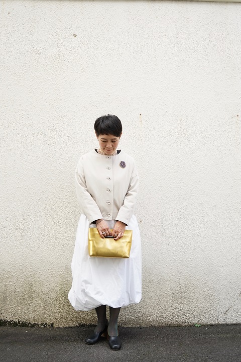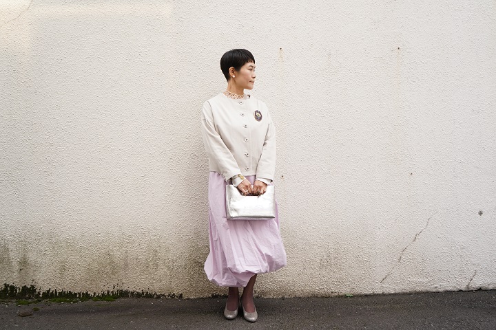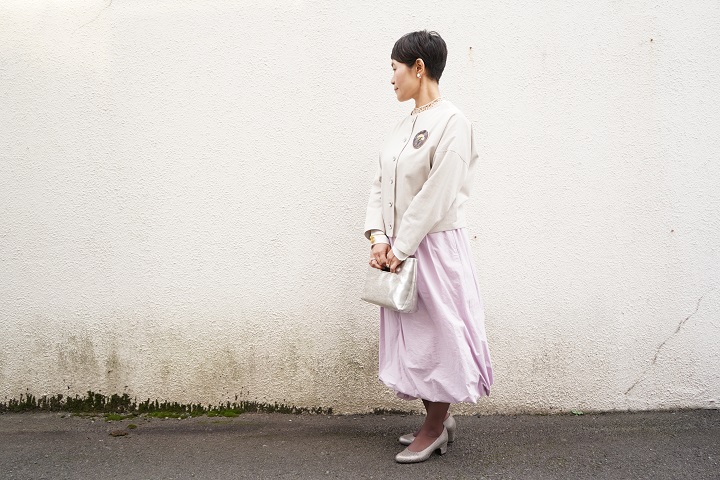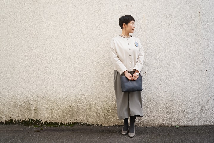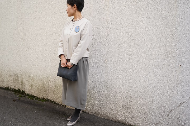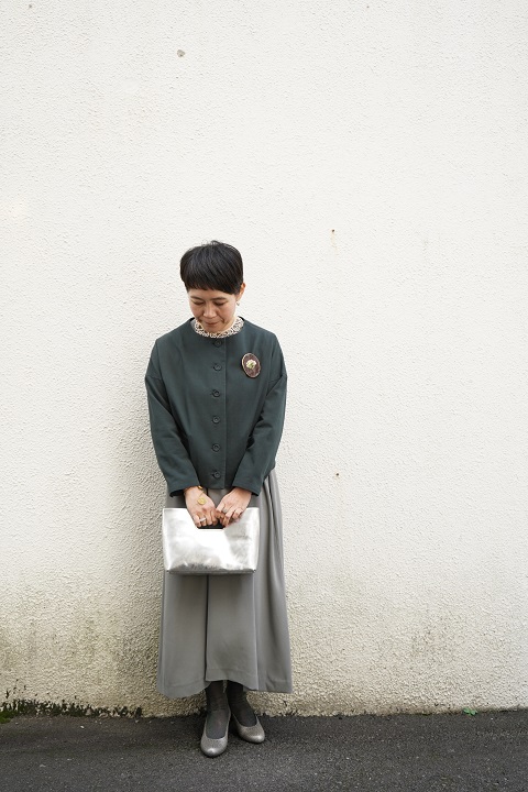 小物は、ワンピースのグレーに合わせるようなスタイリングに。