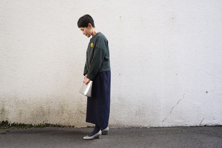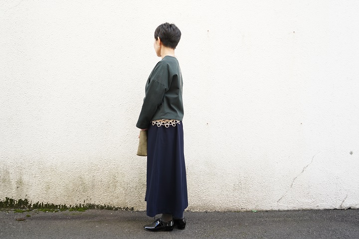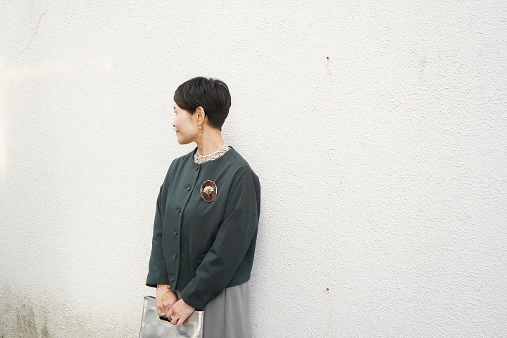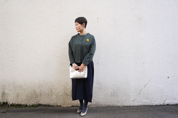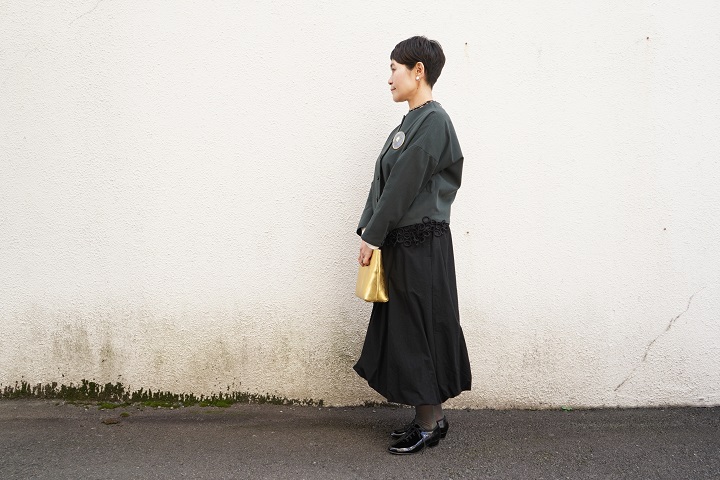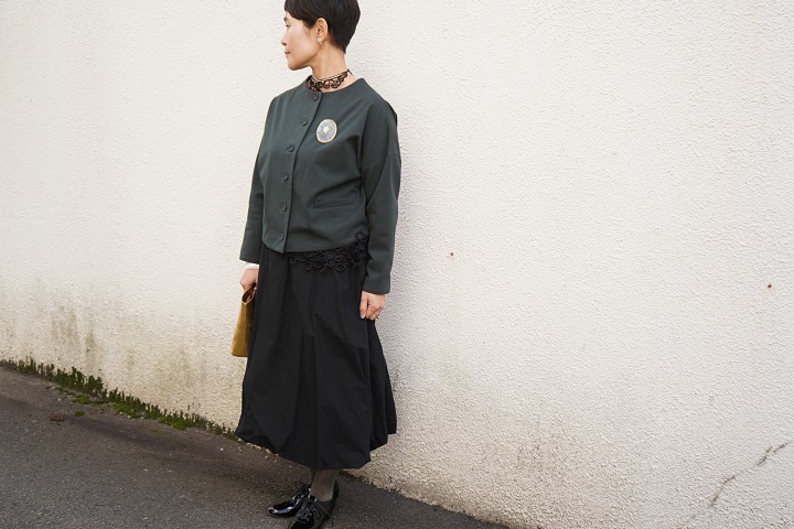 グリーンブラックは主張し過ぎず、合わせたワンピースや