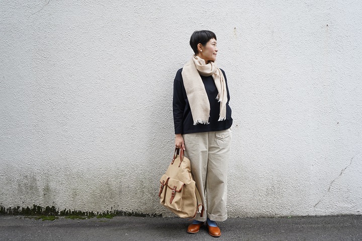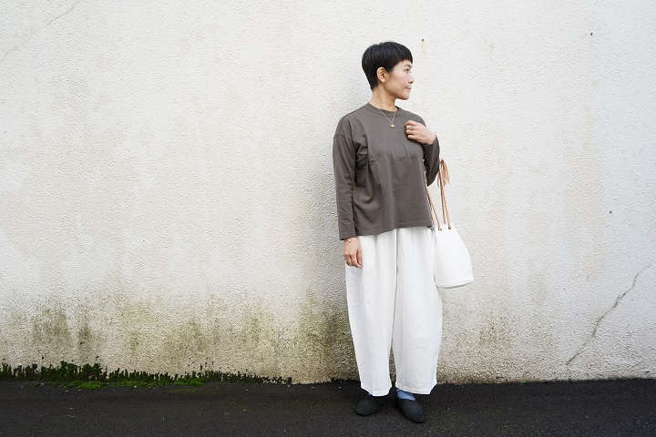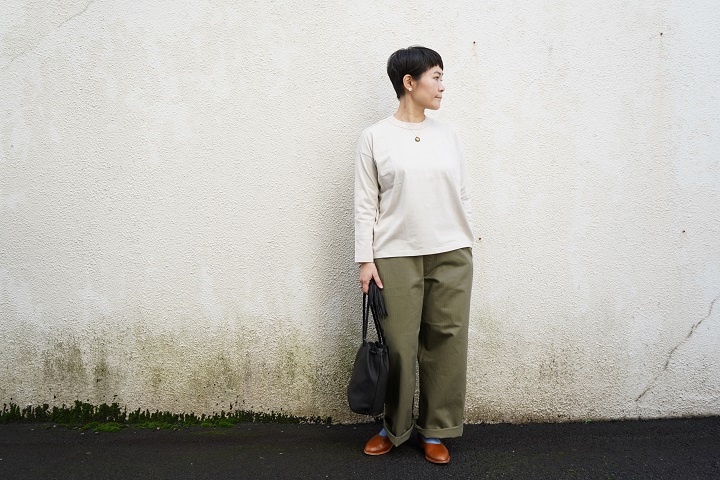 オリーブグリーンのワイドパンツに合わせて、ライトグレージュ。