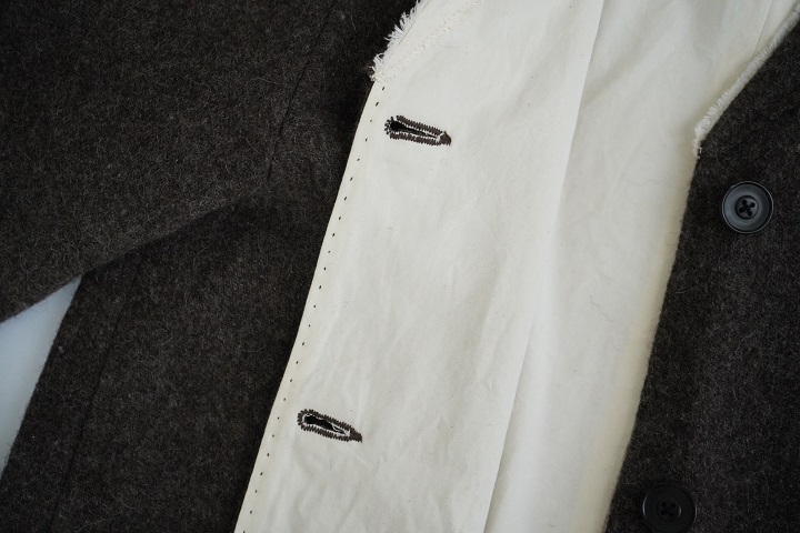 ボタンホールは表地を長方形にカットした布地を重ねて