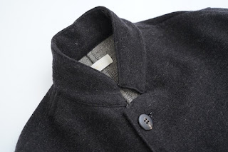 牧師のような立ち襟にくぼみのない平らな大きいボタン。