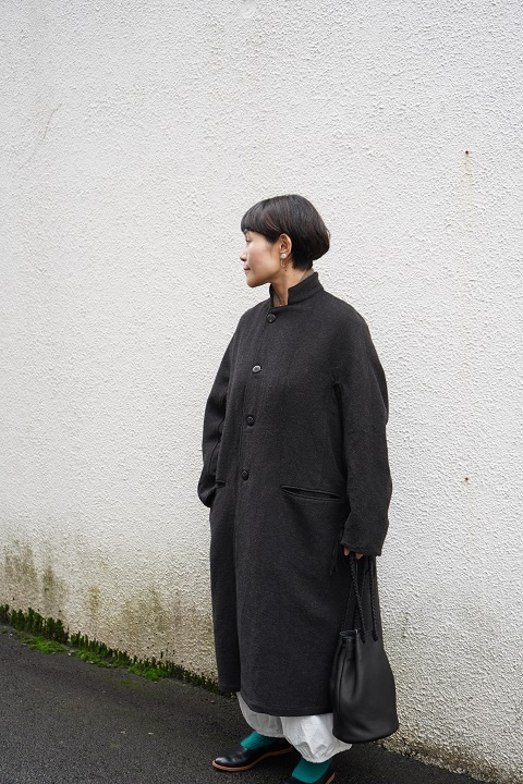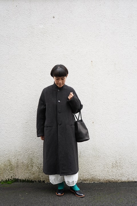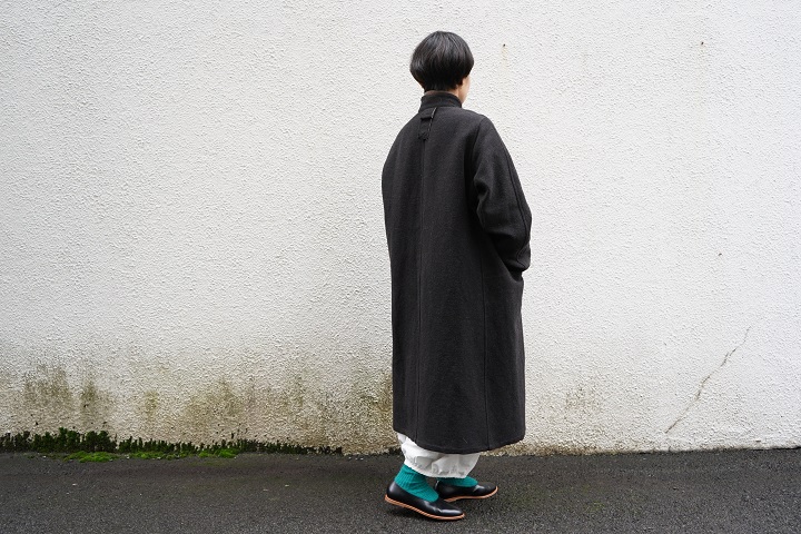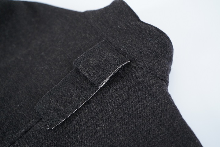 牧師のような立ち襟にくぼみのない平らな大きいボタン。