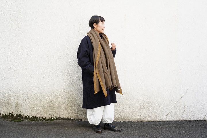 maison de soil のカーキ色の大判ストールを。