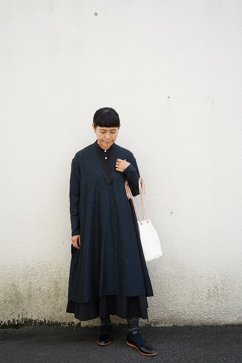 裾周りの大きなワンピースにスッとした細い袖が美しい。