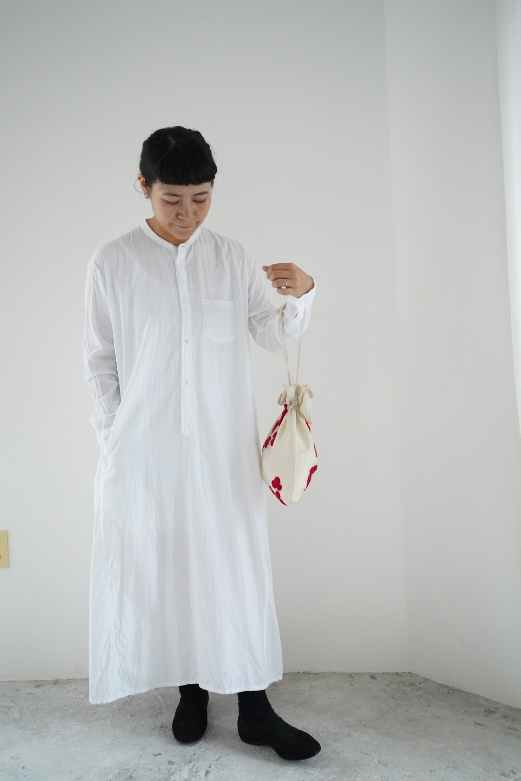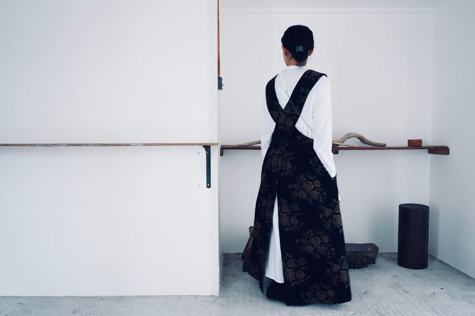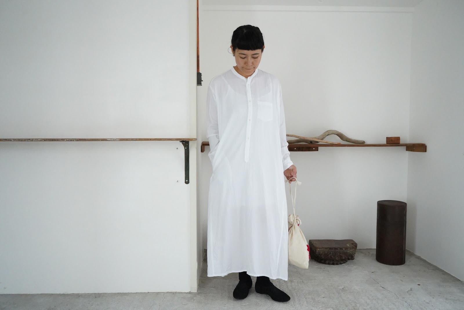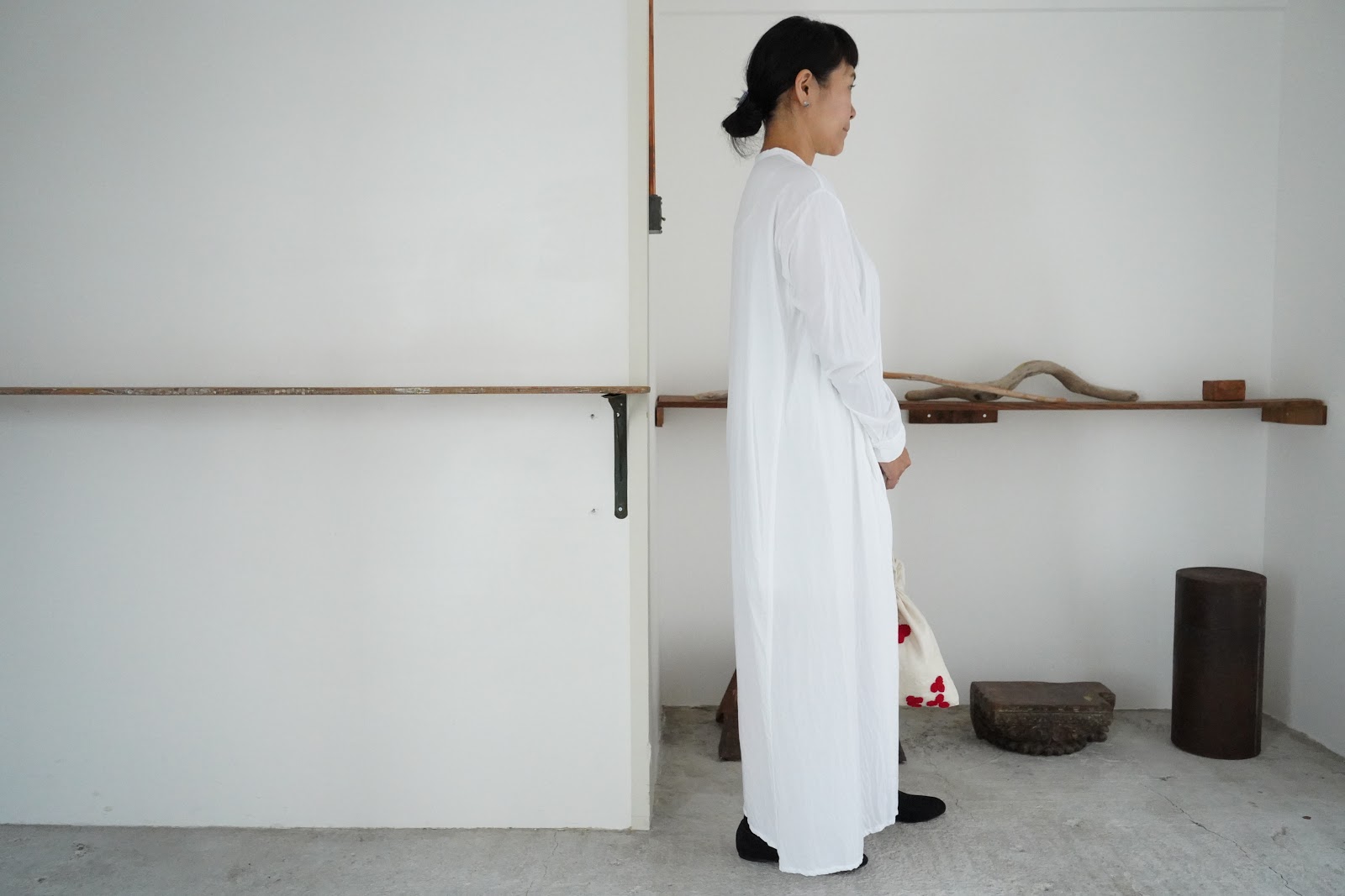 ホワイトの上には、GASA のエプロンワンピースを重ねて。