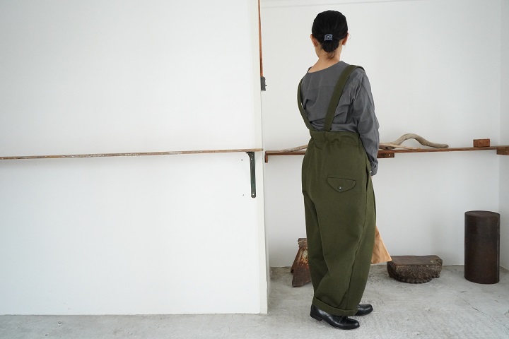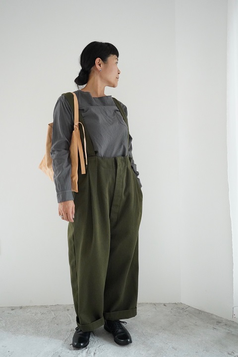 グレーはFIRMUMのサスペンダーパンツに合わせて。