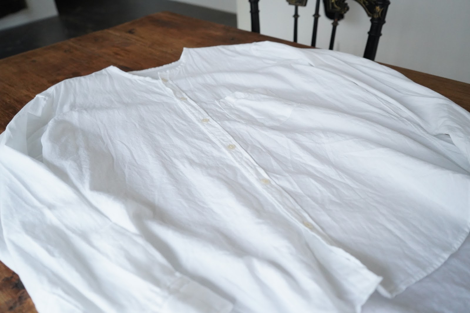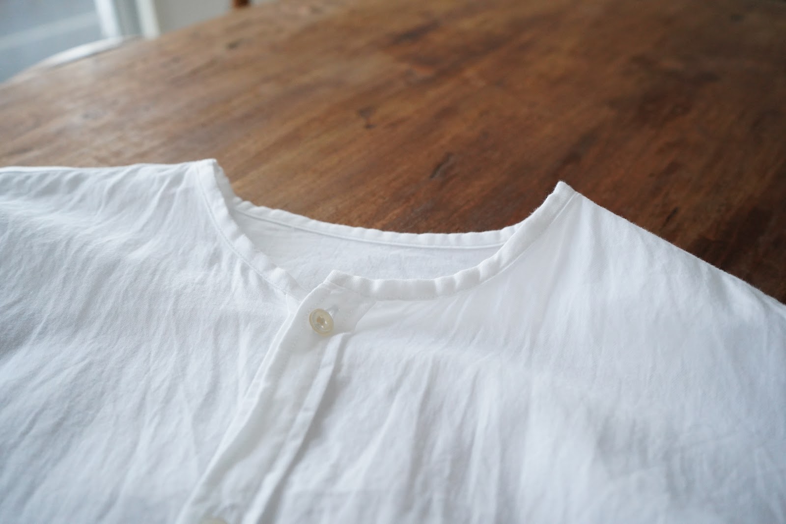 きわめてシンプルなシャツで、襟をなくしたことで