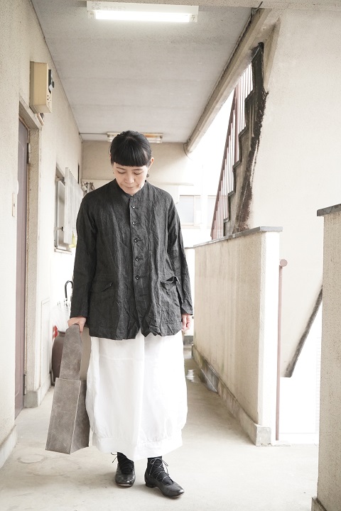 こちらはちょっとキレイめに、evam eva のリネンの羽織。