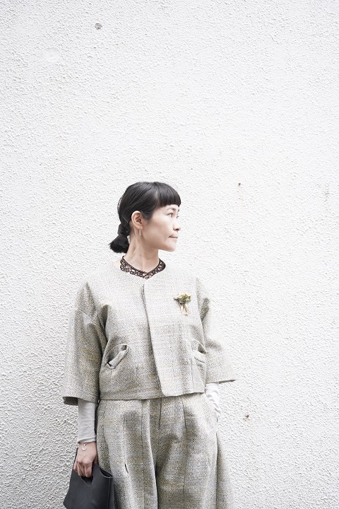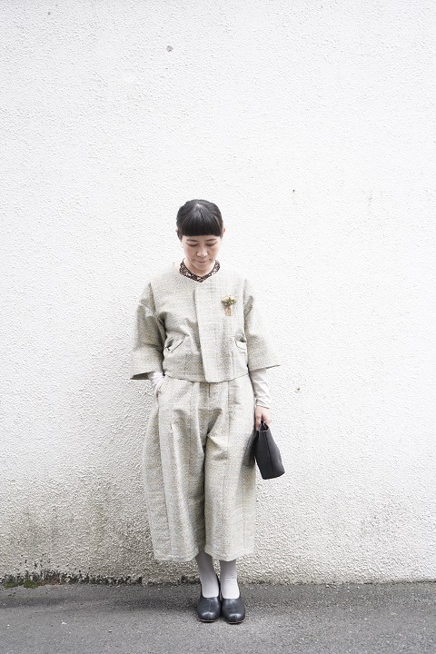 ワイドギャザーパンツとジャケットのセットアップ。