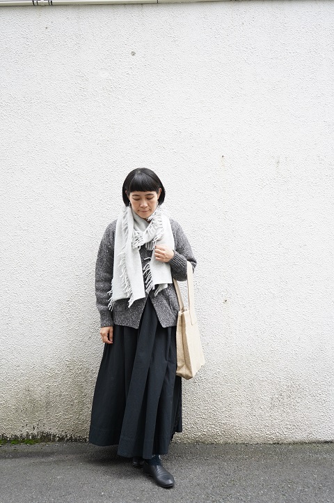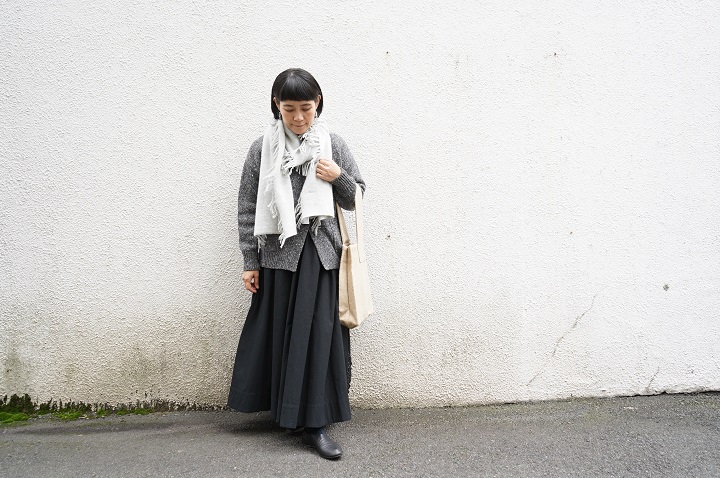 お洋服はワントーンで小物を利かせるスタイリング。