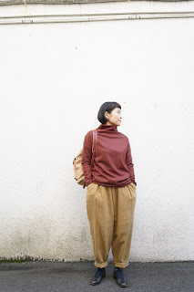 形のいいゴーシュのシンプルなタートルニットを合わせています。