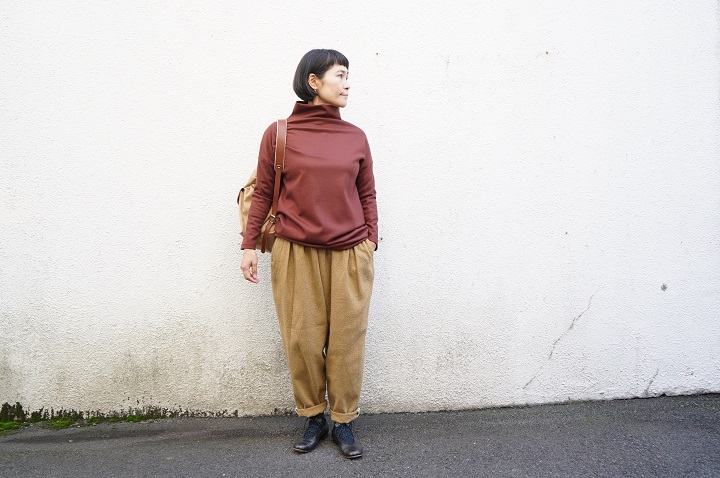 形のいいゴーシュのシンプルなタートルニットを合わせています。