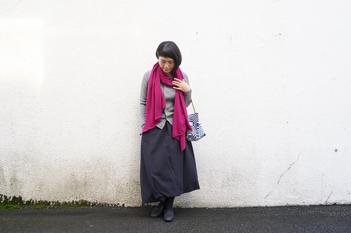 ゴーシュのWOOLワッフルのカーディガンに巻物。