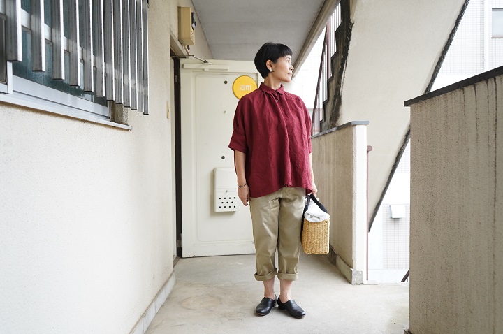 裾の釦を一つ外し、腰回りに結わくようなアレンジで。