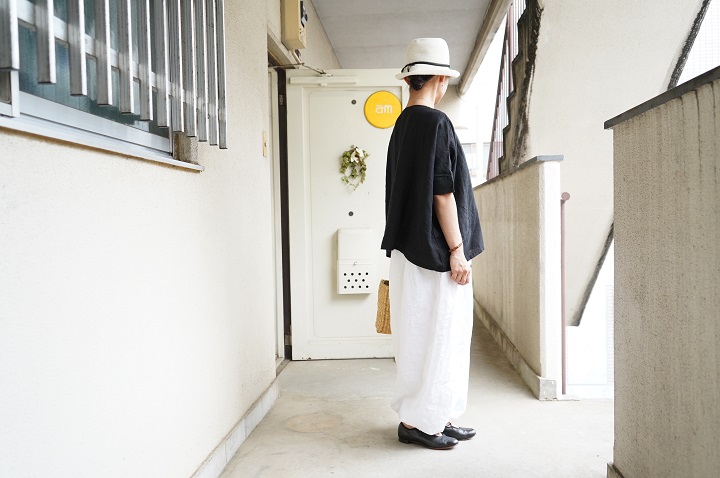 上から黒の薄手のリネンカーデ。