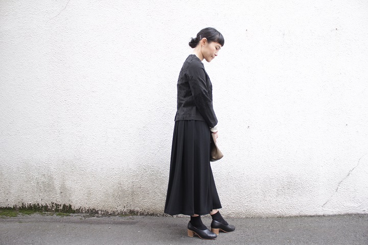フォーマルファブリックのスカートに合わせて。