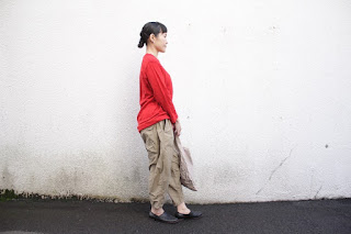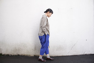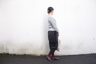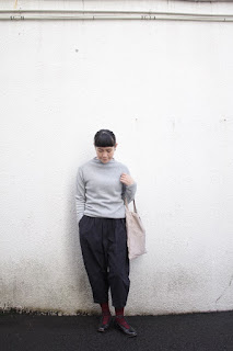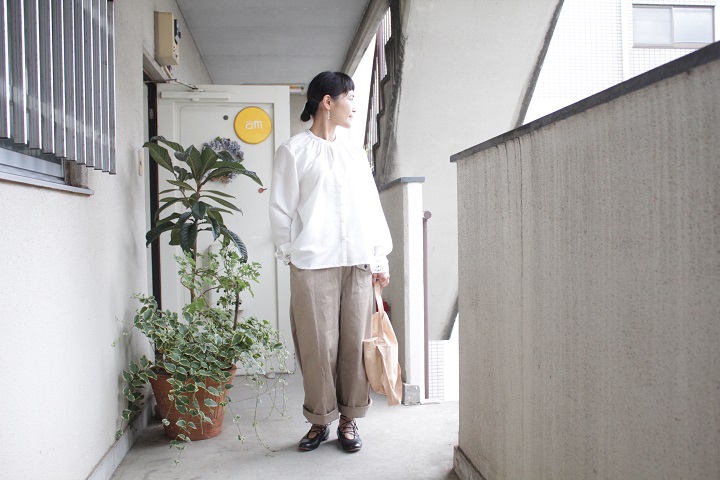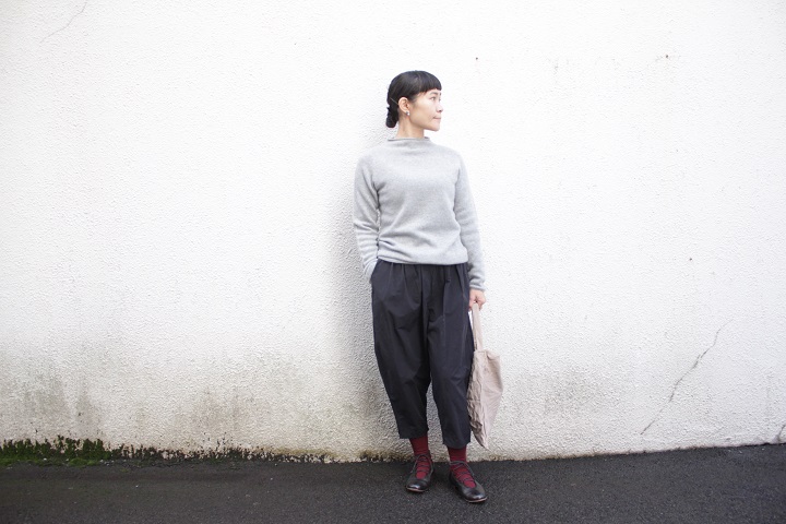 股上の深いボトムスに着丈のやや長めなビッグシルエット。
