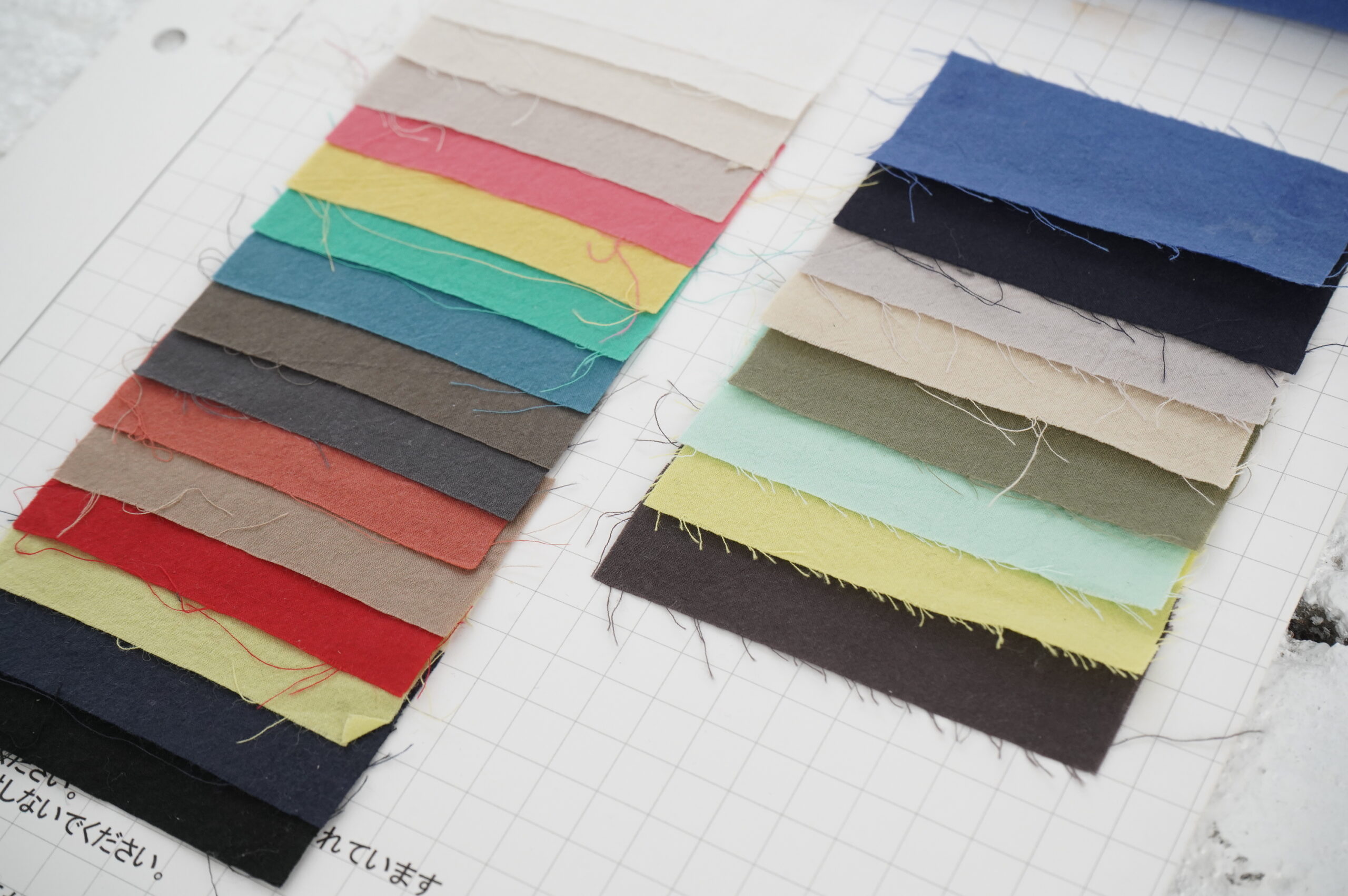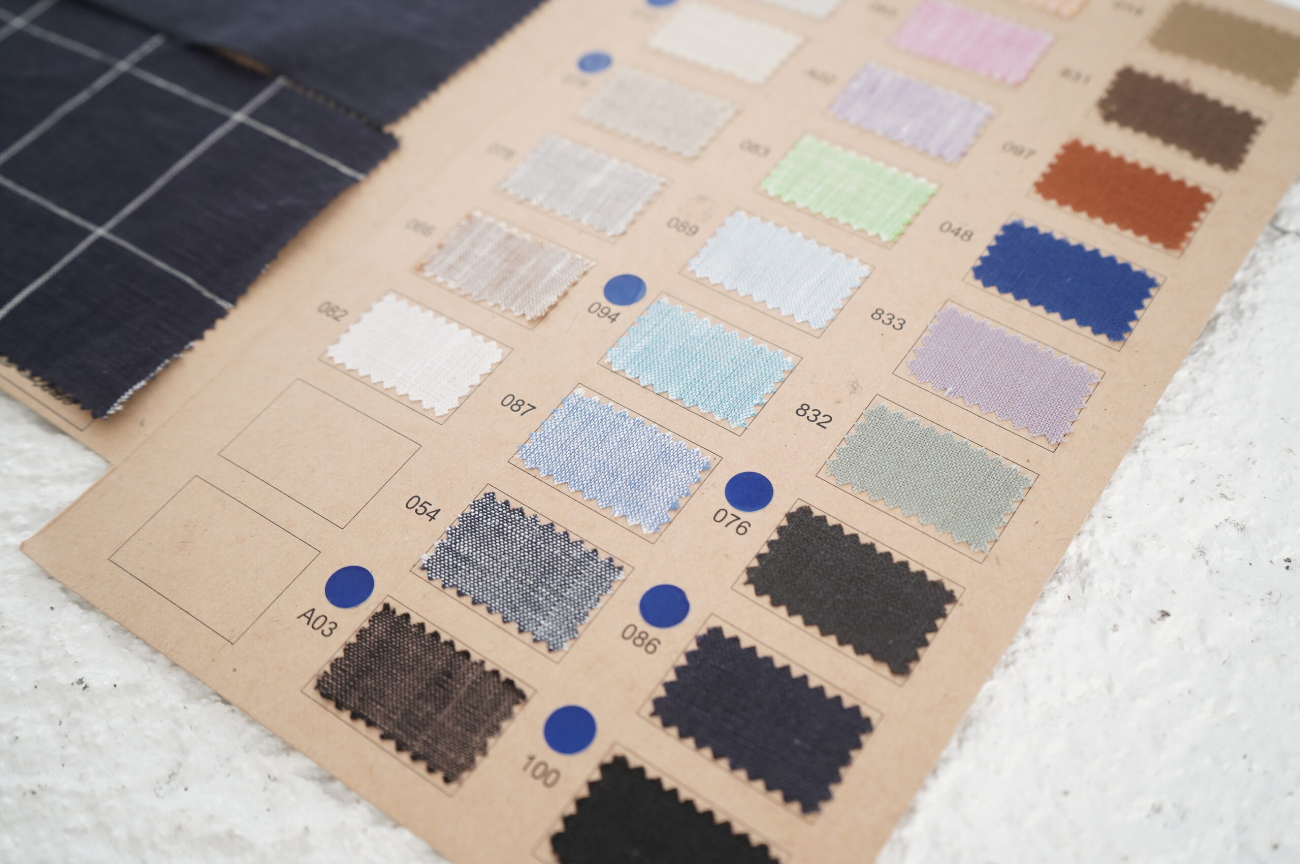 Herdmans Linenのような高級な細番手のリネンから、もう少しカジュアルな国産の天日干しリネンもご用意しています。ものすごい色数で迷ってしまうかもしれないので、僕のおすすめを何色か大きめな生地をご用意はしております。小さい生地だと想像が難しいのですが、できる限り一緒に楽しく選んでいただけるようにサポートしますので、ぜひオーダーにもチャレンジしてみてくださいね。