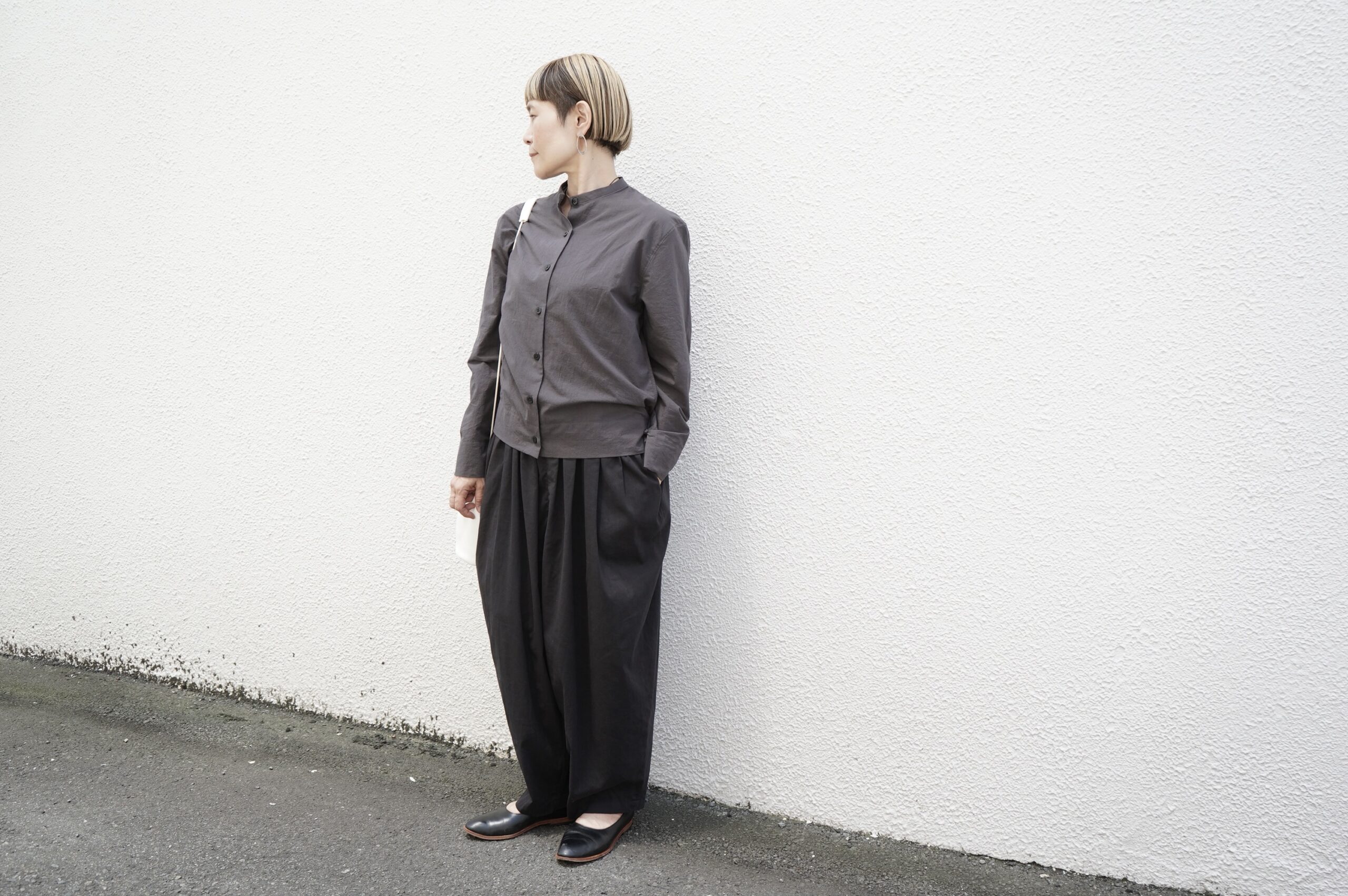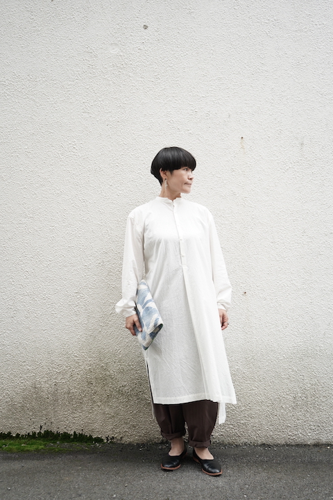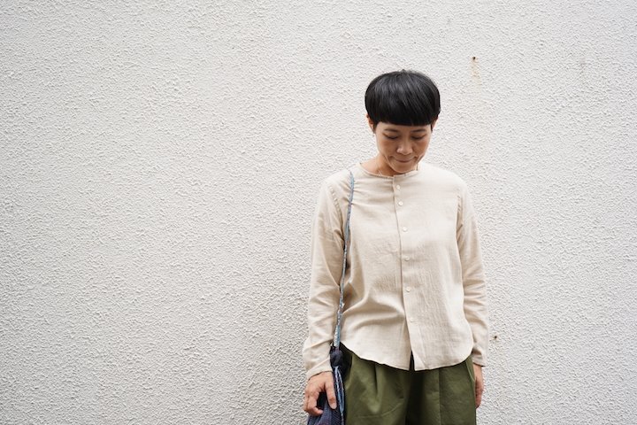 こちらはアナベルでおそらく今は一番人気かもしれないバンドカラーシャツ。こちらはざっくりとしたベラルーシリネンですが、お客様のお好みのリネンやコットンで色も豊富にございますのでじっくりと選んでいただきたい。