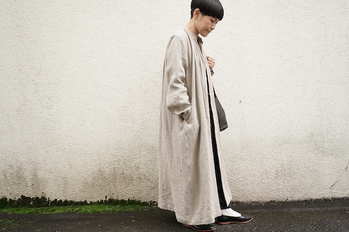 ちょうど見えませんが、裾脇あたりに絞れるタブとボタンがあって、これは絞った状態です。こちらは昨年リネンとコットンを同時に展開しましたが、この形を例えば超高級素材で思い切るのはいかがでしょう?